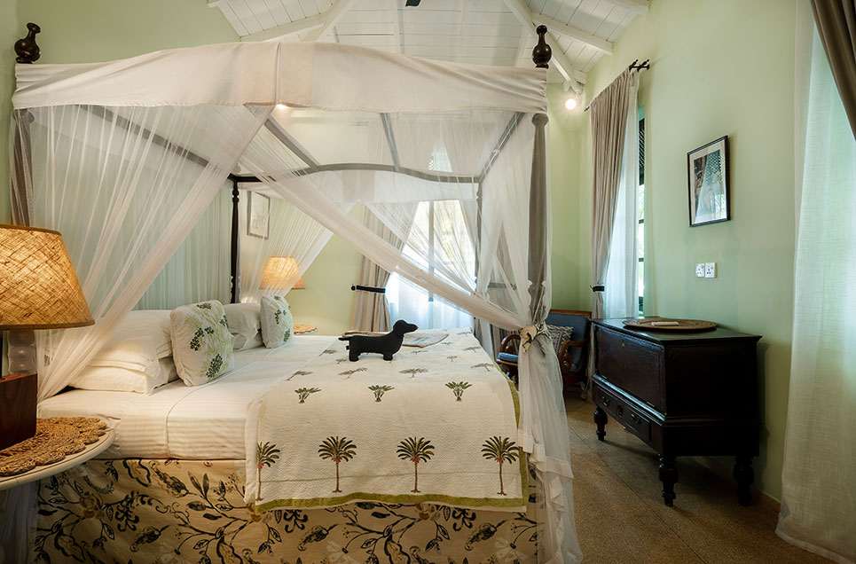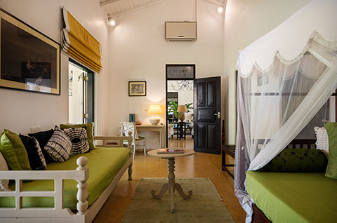 We have two suites in the main house with large king beds, with an ante room which can accommodate two extra single beds, perfect if you want to be close to but not share a bedroom with your children. This is available for those with children between the ages of 3 and 12, cots for infants are available and will be provided with no extra charge. An over-sized bathroom with large walk in shower makes this a perfect room for families.